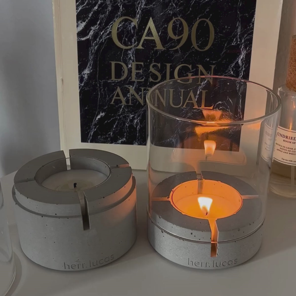 Crafted from solid concrete and paired with a precisely formed borosilicate glass cylinder, this minimalist candle holder embodies timeless simplicity and modern refinement. The subtle recess in the concrete base lets a tealight nestle seamlessly within, creating a calm, floating glow that enhances any space.